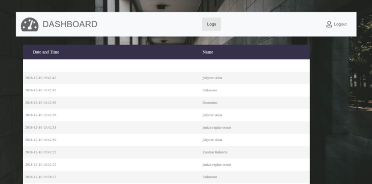 The dashboard displays the logs of all the individual from the video that is entering in the premises. The logs contain the date and time of the individual and as well as the name or the unrecognizable person that the system detect.