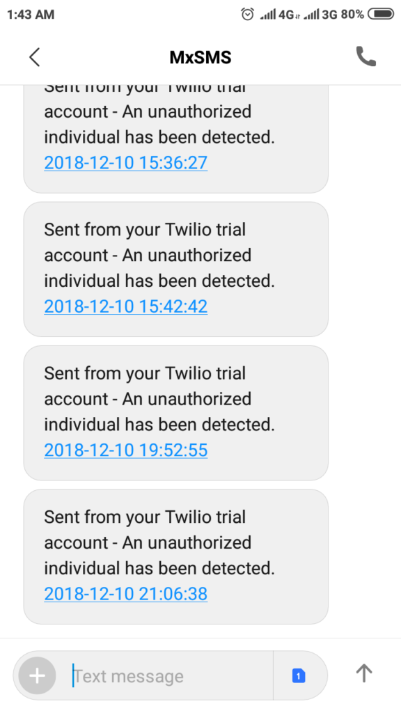 Sample text received by the user if unauthorized person enter the premises.
